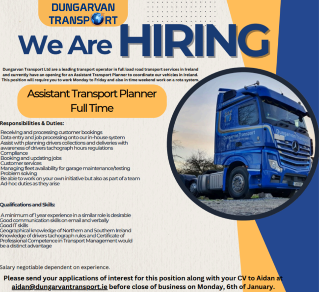 Job Alert: Waterford's largest transport business Dungarvan Transport are now hiring