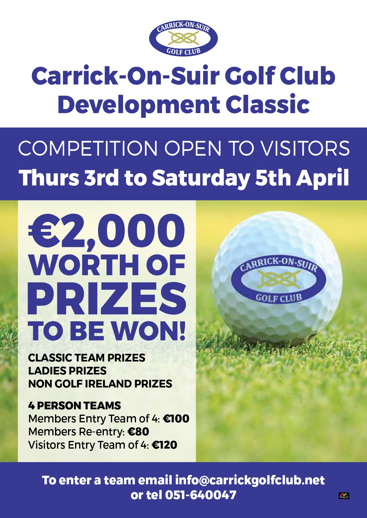 Carrick-on-Suir Golf Club's Development Golf Classic that takes place next week will have €2,000 worth of prizes for winning teams and golfers.