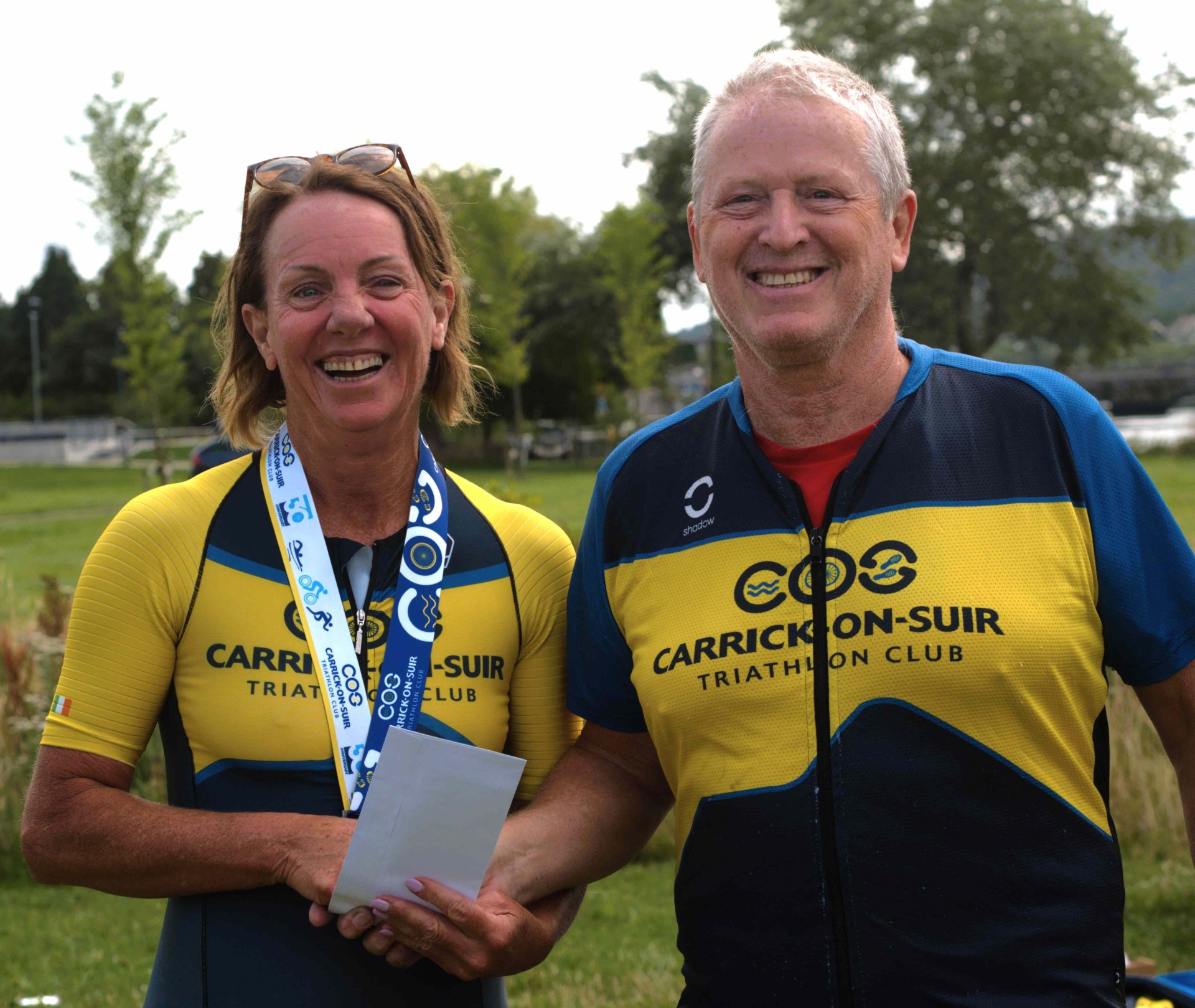 Eileen Skelly of Carrick-on-Suir Triathlon Club, who came in second place in the female (60-69) age group, with Chairperson of the Carrick-on-Suir Triathlon Club Garry McCarthy