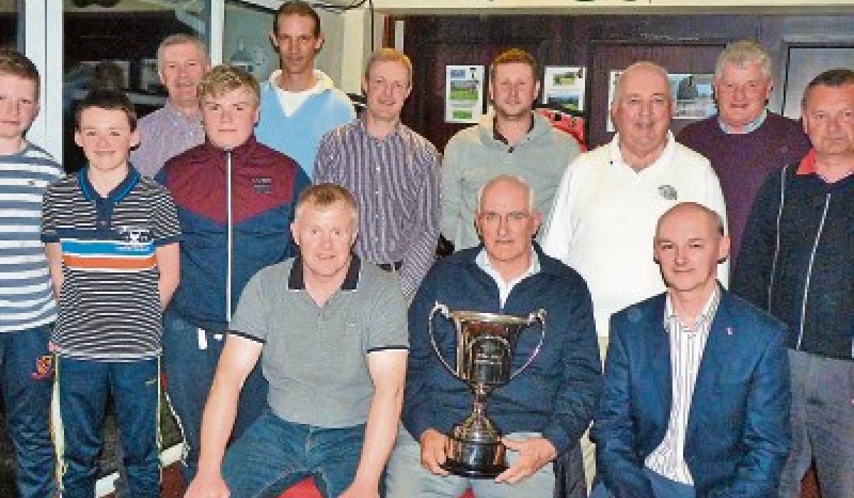 Pictured at the Ballingarry GAA Club 20th annual Friends Of Ballingarry GAA Golf Classic in Callan Golf Club over the weekend winning team member Liam Duggan (centre) accepting the Donal Kealy Perpetual trophy from Ballingarry GAA Club Chairman Michael Fitzgerald (on left) & Richard Kealy (Classic Committee Chairman) on right with other team winners in the back row.