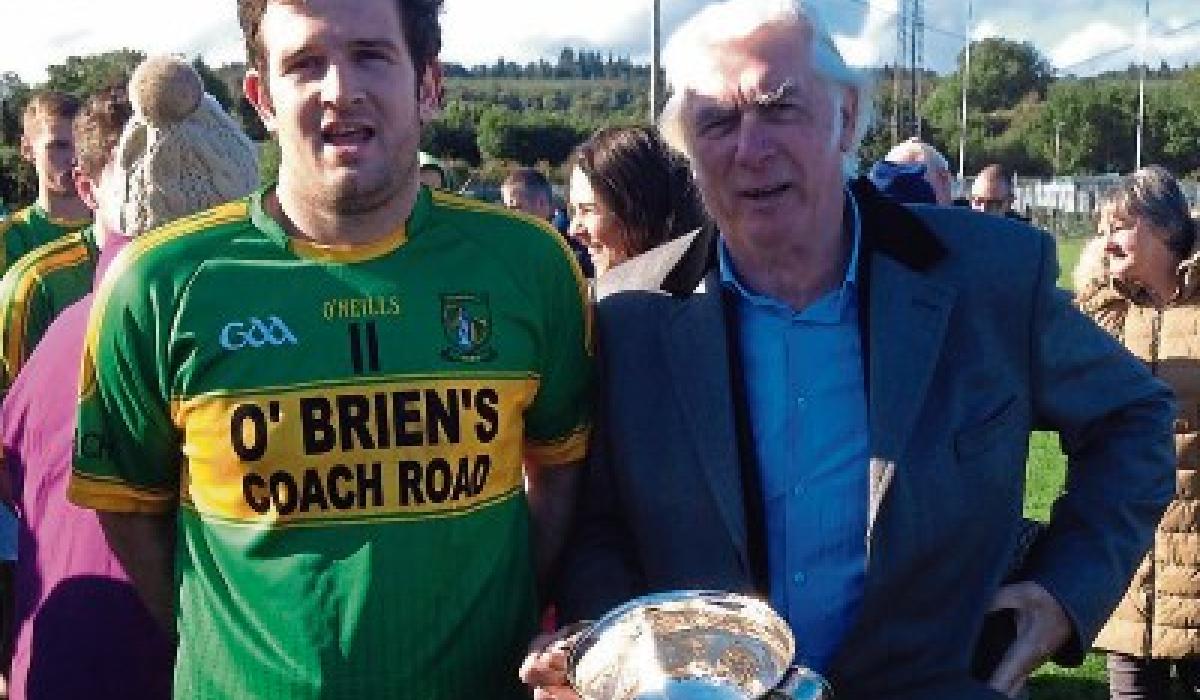 Referee: Johnny Butler Captain, Barry Grogan receives the cup from John O'Shea, West Board chairman after Aherlow Gaels beat Galtee Rovers in the West Senior Football Championship Final in Dundrum on Sunday.