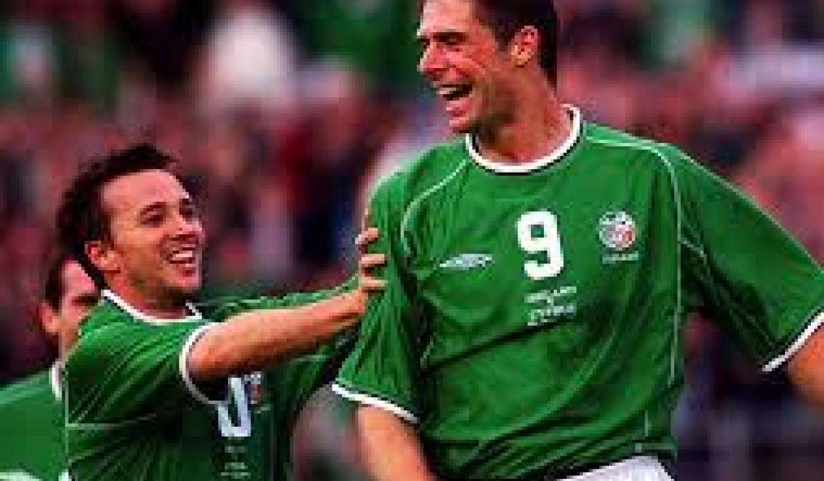 Niall Quinn celebrates scoring one of his 21 goals for Ireland