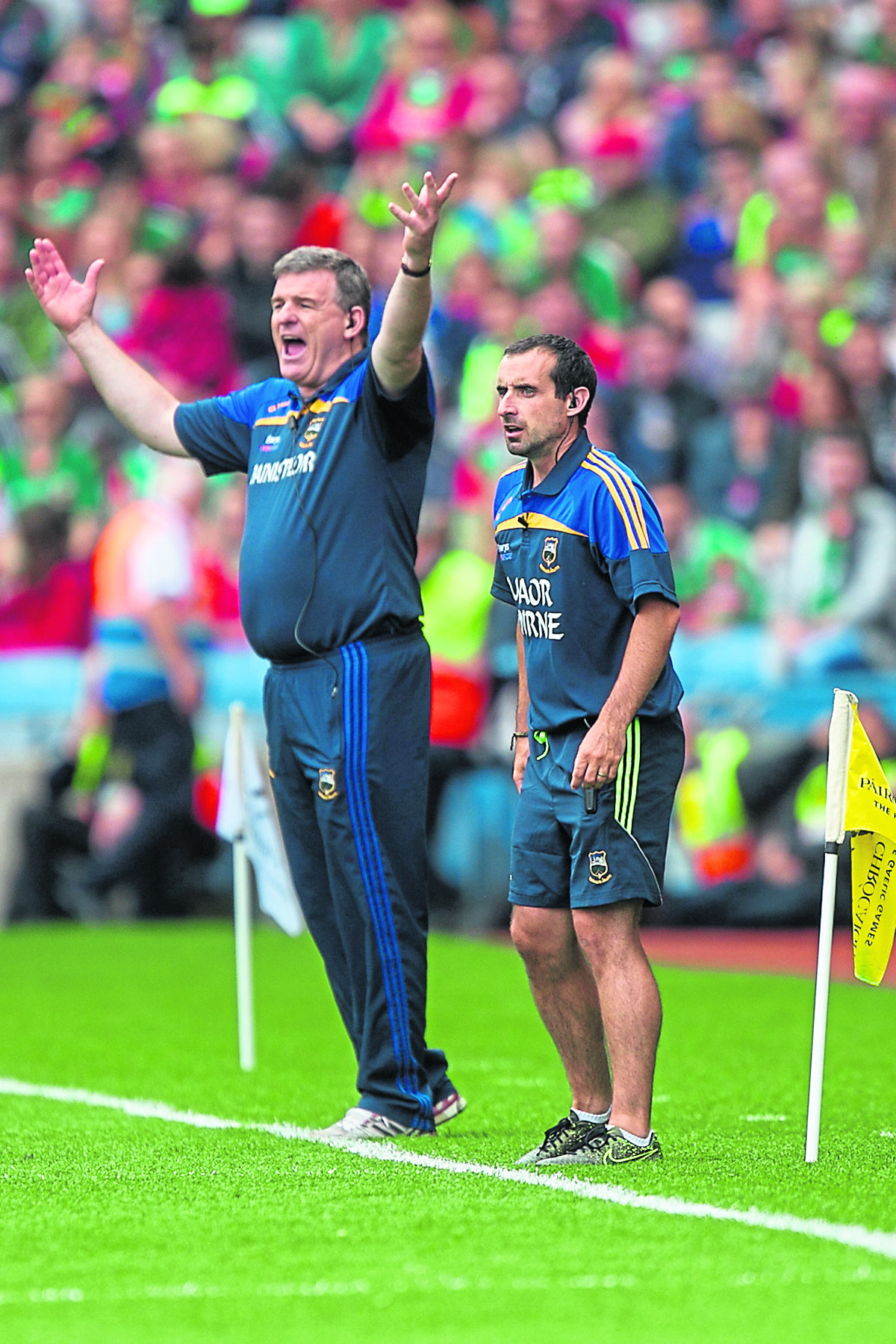 Tipp manager Liam Kearns and Tipp selector Shane Stapleton pictured at Croke Park. Stapleton was injured after a collision with Clare forward Jamie Malone at today's game in Ennis.
