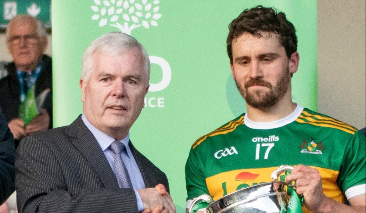 County Football Committee chairman Barry O'Brien presents the O'Dwyer Cup to Clonmel Commercials captain Donal Lynch after Saturday's FBD Insurance County Senior Football Championship Final