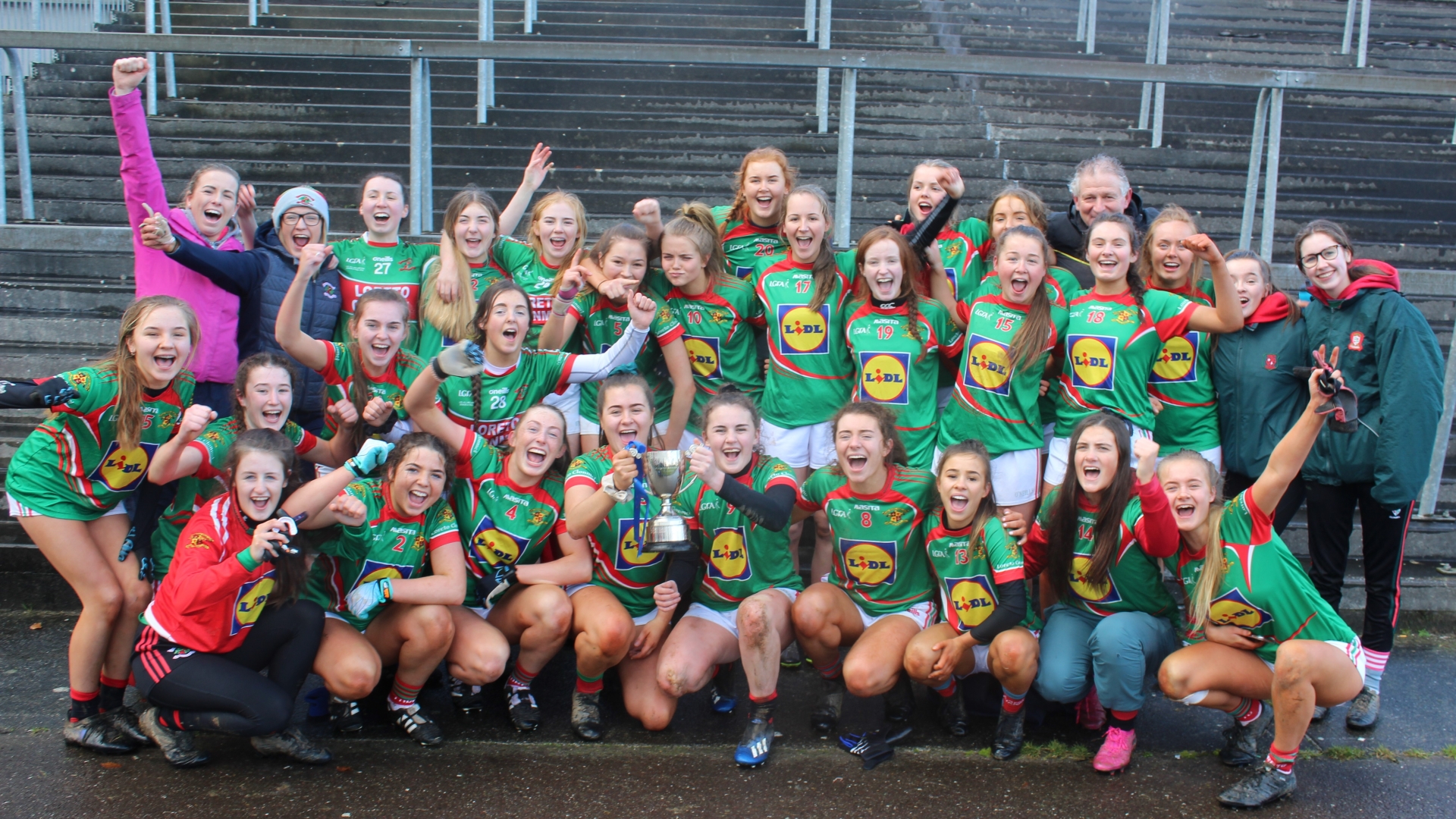 Above: The Loreto Clonmel players celebrate with the cup after their great victory over St. Mary’s of Midleton in the Munster Final
