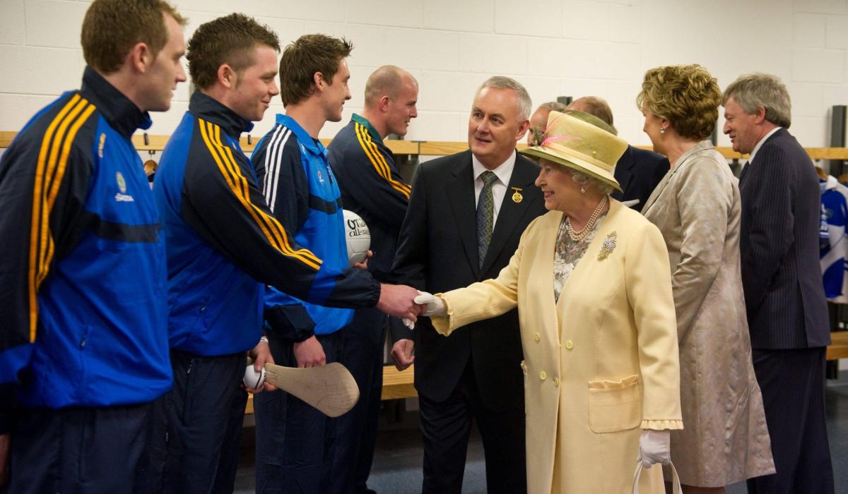 Padraic Maher and Lar Corbett greet Queen Elizabeth and Prince Philip (hidden) at Croke Park in 2011