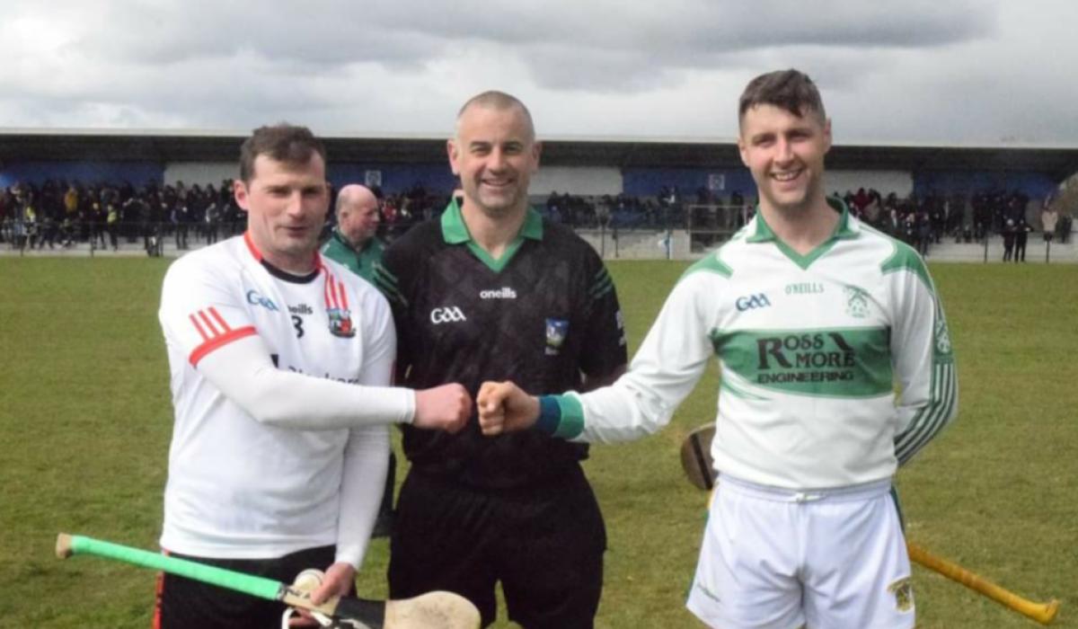 Team captains, Clonoulty Rossmore's Martin Sadlier (right) and Cappataggle's Michael Broderick, with referee Eamonn Stapleton before the start of Saturday's final