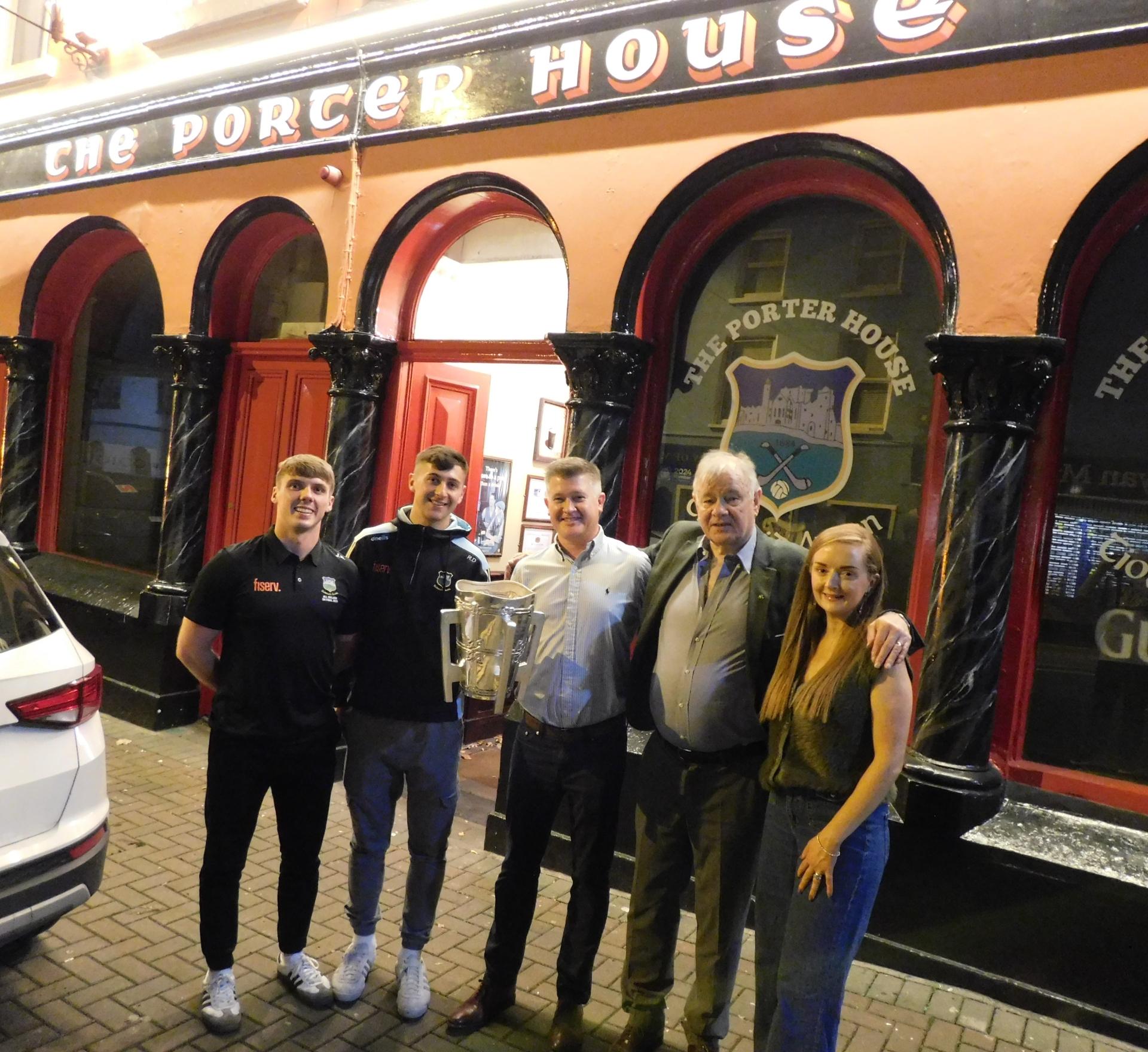 Tipperary hurlers Johnny Ryan and Robert Doyle, pictured with Stephen, Eamonn and Joan Ryan outside their premises the Porter House, Tipperary Town.