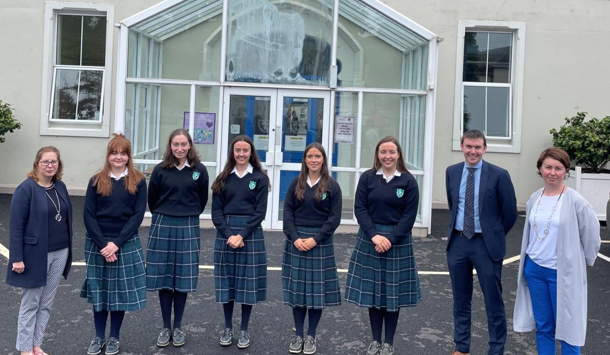 Leaving Cert students Katie Coffey, Alyssa Franks, Hannah Kate Heffernan, Aine Looby, Caitlin O’Dwyer and Joanne Donnelly (Year Tutor), Jeanne Dowling (deputy principal), John Cullinane (principal)