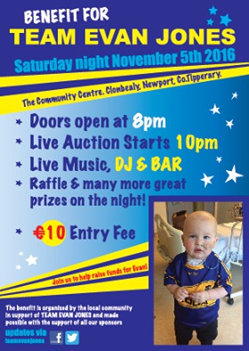 Raffle and benefit night tickets are available from Team Evan Jones committee members and local retail outlets in Newport.
