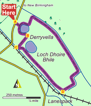 The existing loop follows bog roadways and green tracks along streams and lakeshore through a redeveloped area of old Bord na Mona peatland which has become a wildlife sanctuary, particularly for birds.