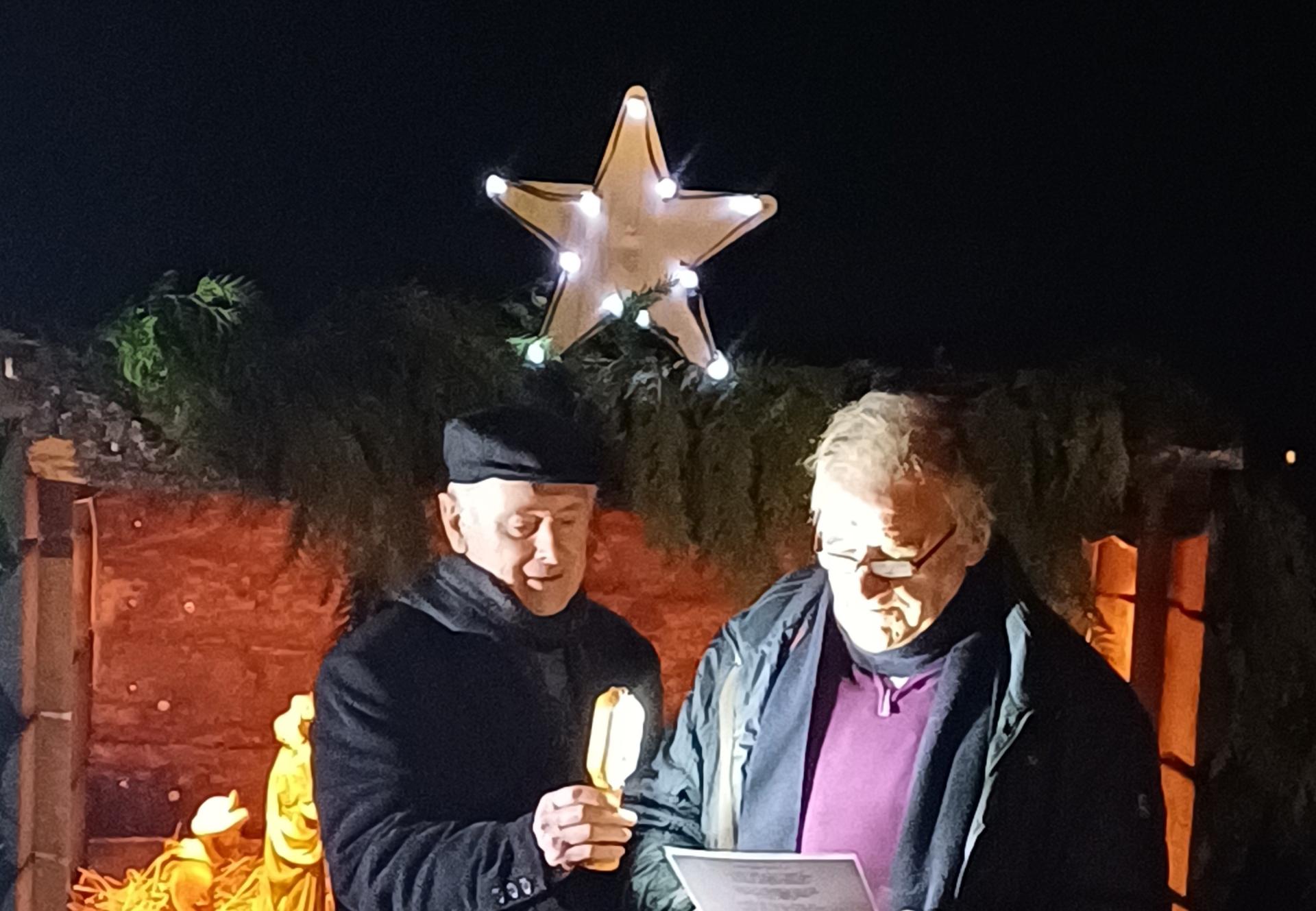 Michael Boland spoke about the significance of Solstice night, emphasizing themes of light and the birth of Jesus Christ. The Crib with 100-night lights flickering – representing our deceased loved ones.