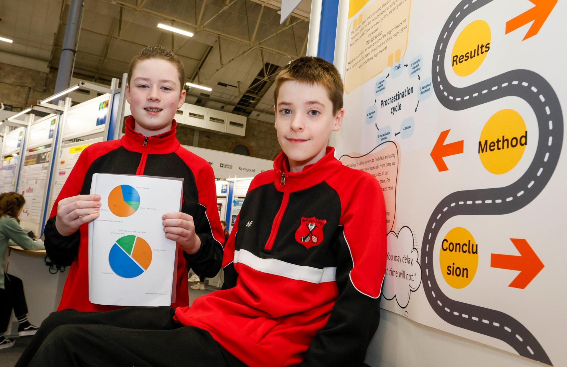 Pictured are students Aaron Kelly Maslen Briggs from Newport College in Tipperary, with their project, 'The science of procrastination', at the 2026 Stripe Young Scientist and Technology Exhibition.