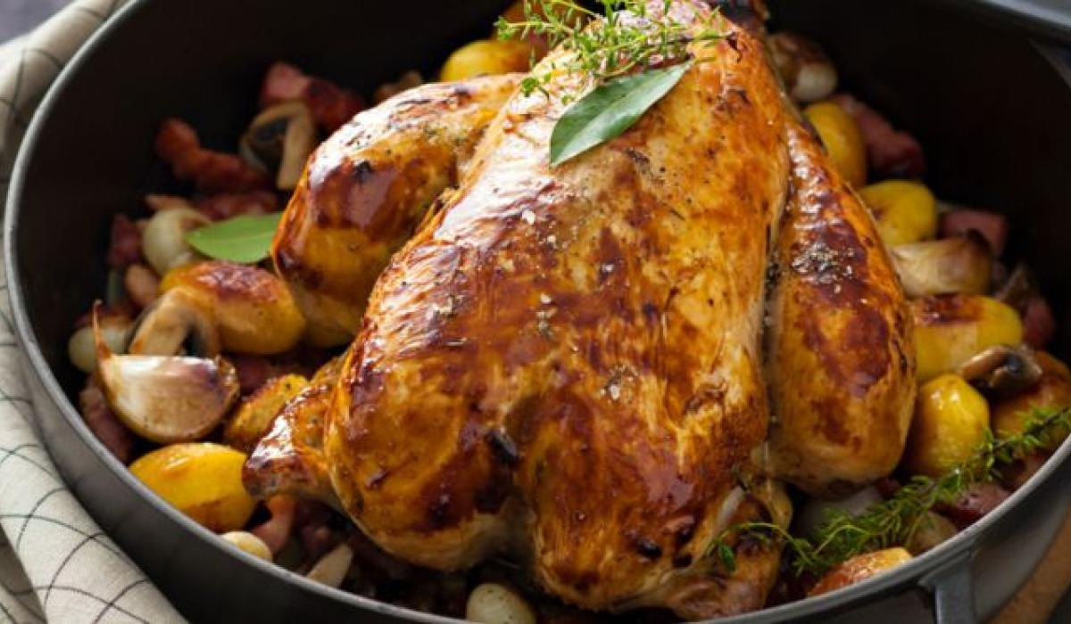 - Cut the chicken into serving portions. Scatter the vegetables and lardons over the chicken, pour over the juices and sprinkle with chopped fresh parsley.
