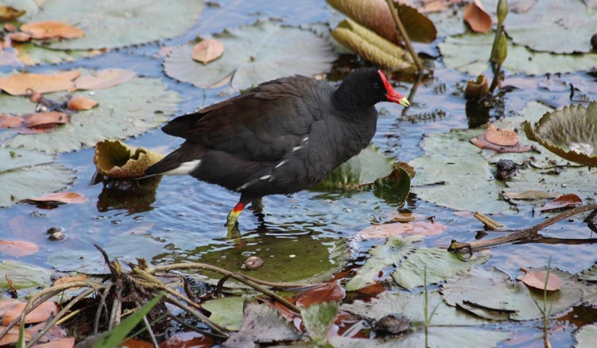 The moorhen hunts for food on land as well as in water and when feeding in water it rarely dives. It has a broad diet including worms, snails, insects and their larvae, spiders, fish, acquatic plants, berries and even small mammals. The moorhen can live for over eighteen years but the average life span is about three years. It is called “An Cearc Uisce” in Irish. It breeds in any type of wetland habitat ranging from large lakes to small ponds and slow moving waterways. An estimated 75,000 pairs were found breeding in Ireland during the last Breeding Atlas of Ireland Survey.