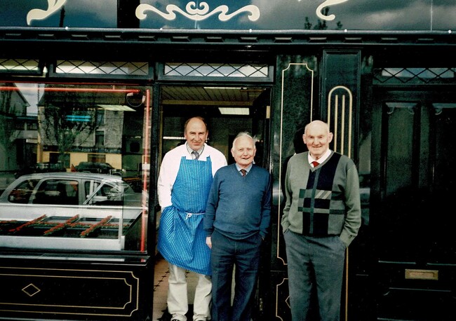 Jim Farrelly, Liam O’Dea and Billy Kelly pictured outside Farrelly’s butcher shop. All of these men have sadly died but were an integral part of everyday life in Templemore.