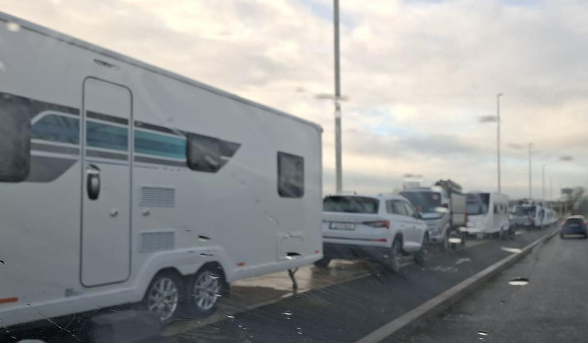 Limerick Live has been sent videos and photos of up to 20 mobile homes and 20 associated vehicles parked up on the side of the road in Croom this Monday. The footpath and bike lanes are blocked in places, forcing students out onto the road.
